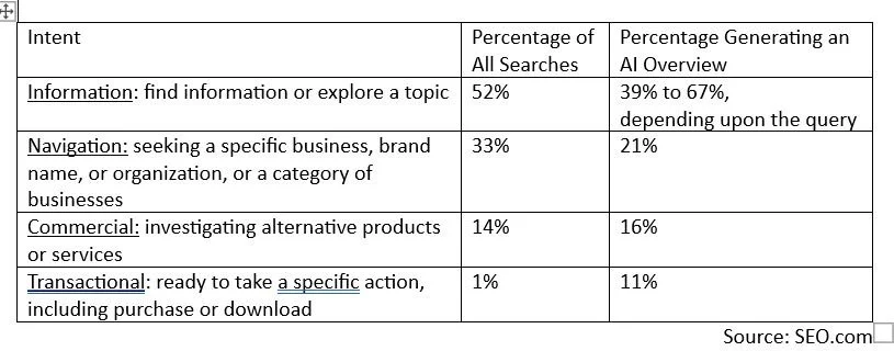 AI Overviews and Summaries are now providing users with relevant information without requiring a click on any search results. This is particularly true of informational searches which comprise more than half of all searches. These overviews and summaries can also significantly affect the results of other types of searches as well. The visibility of your website is diluted as AI steps between the user and your search listing.